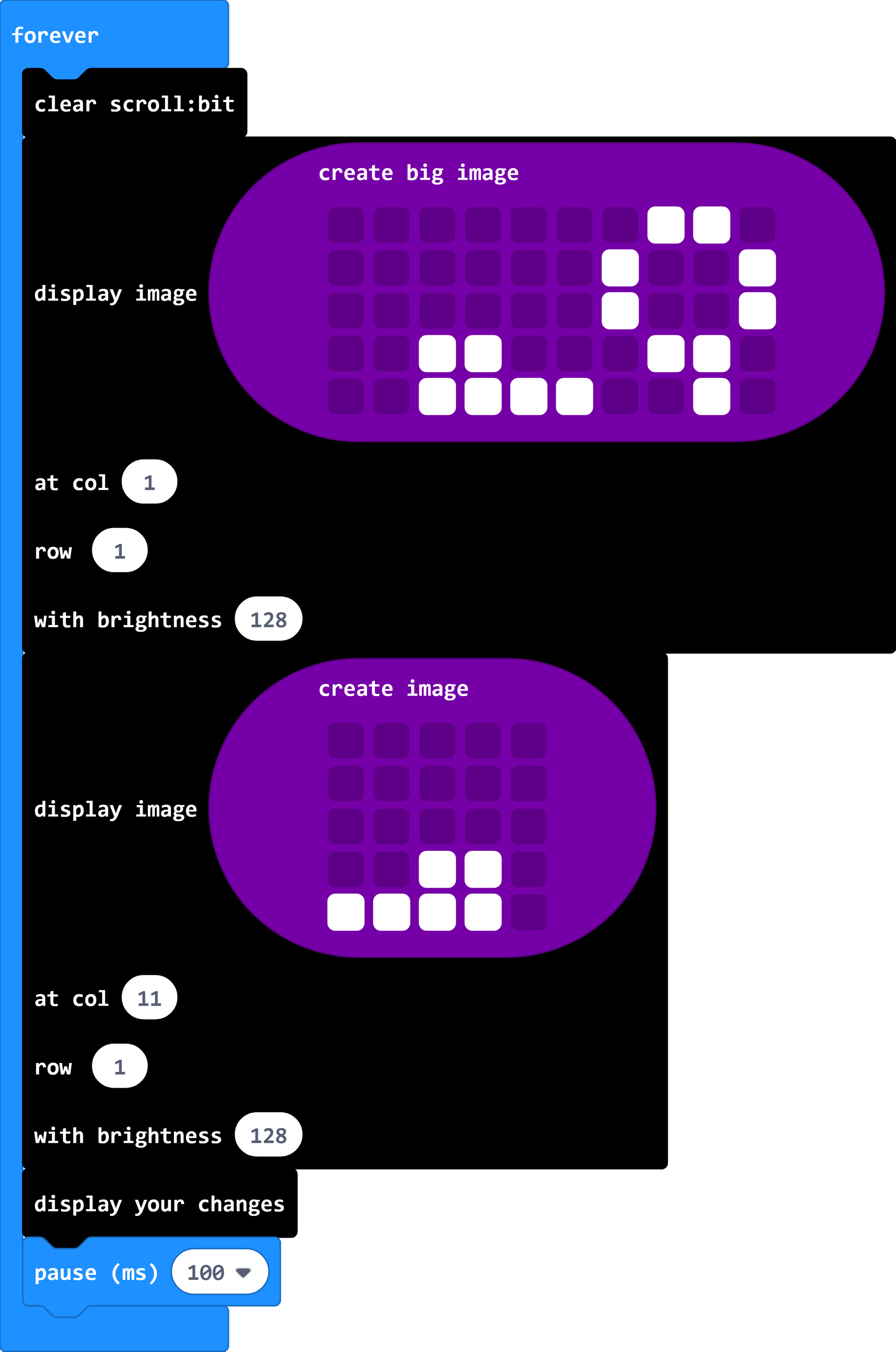 What you will learn: how to show a short animation on the scroll:bit, how to combine two images to make a larger one