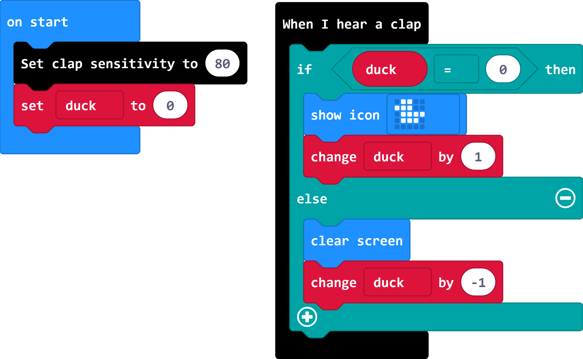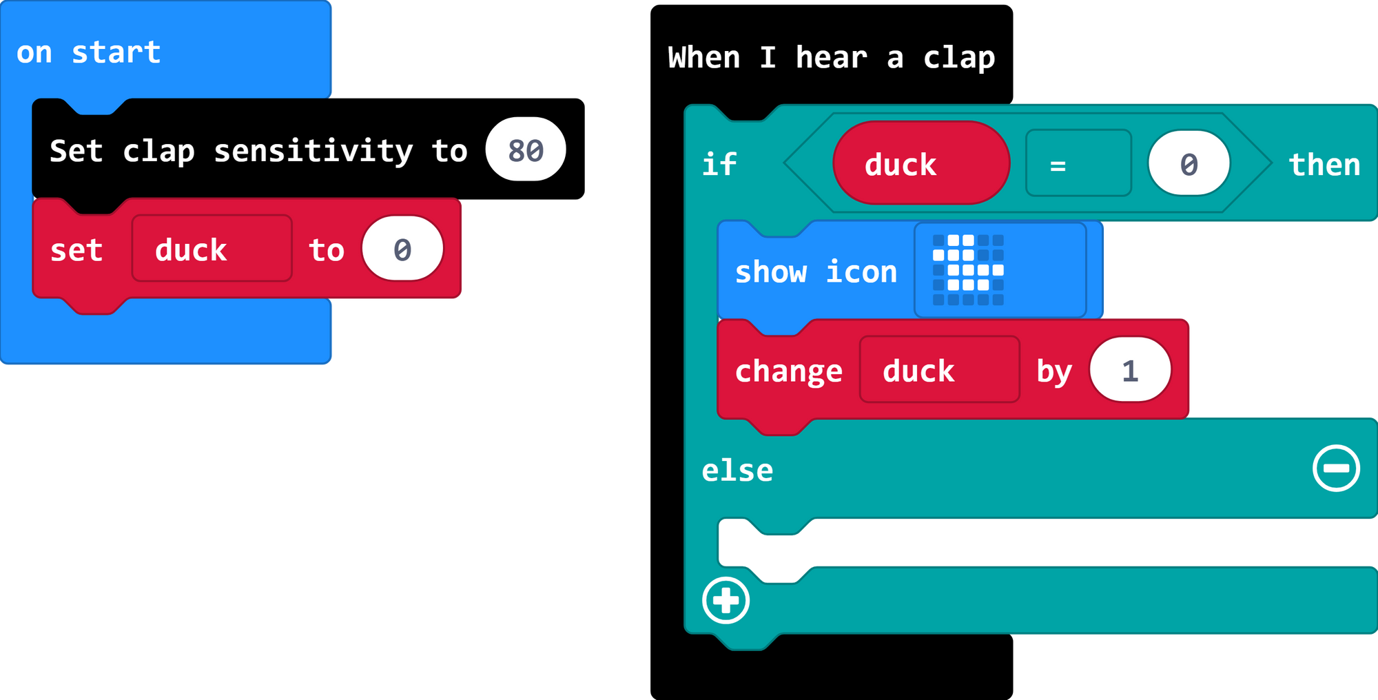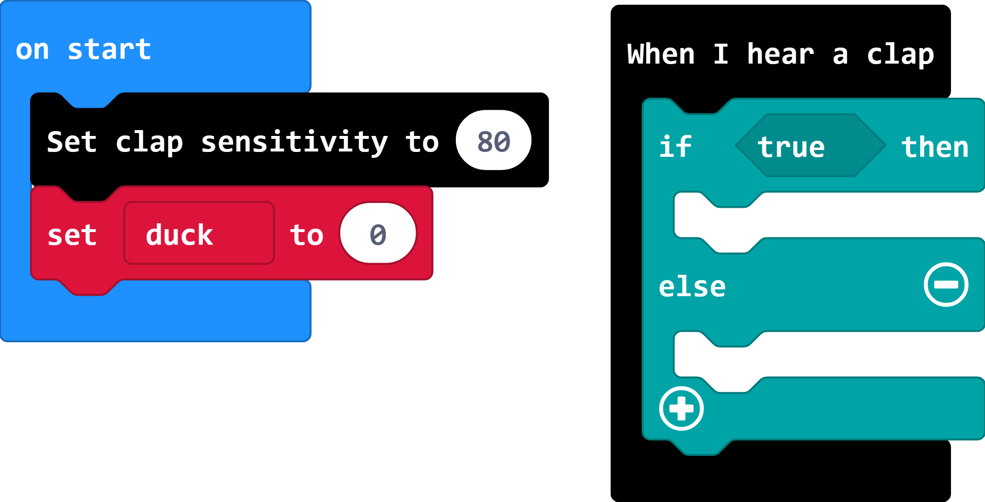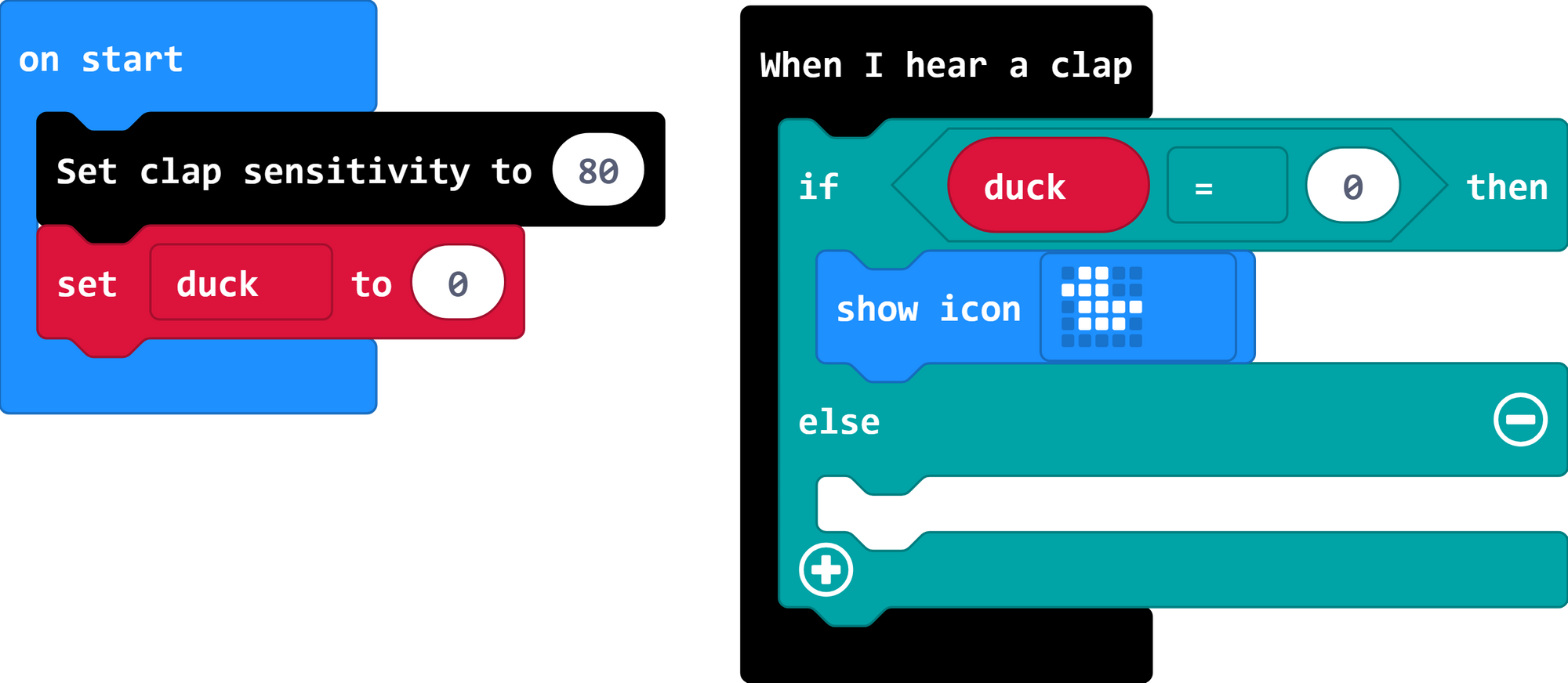 2. Now we need to listen for a clap, and then check whether there is a duck or not. In the logic menu, you will find a block for "if ___ then, else"