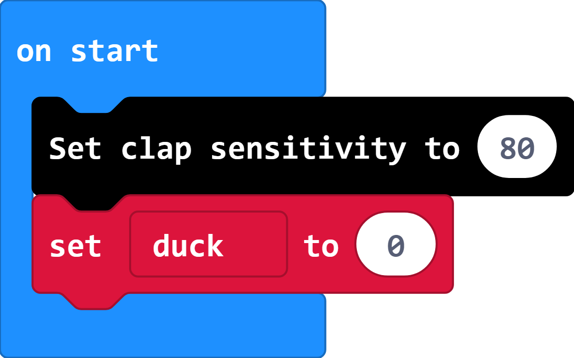 1. In the variables menu, create a new variable called "duck". In the "on start" block, add in a block from the variables menu to say that at the start of the program, there is No Duck.