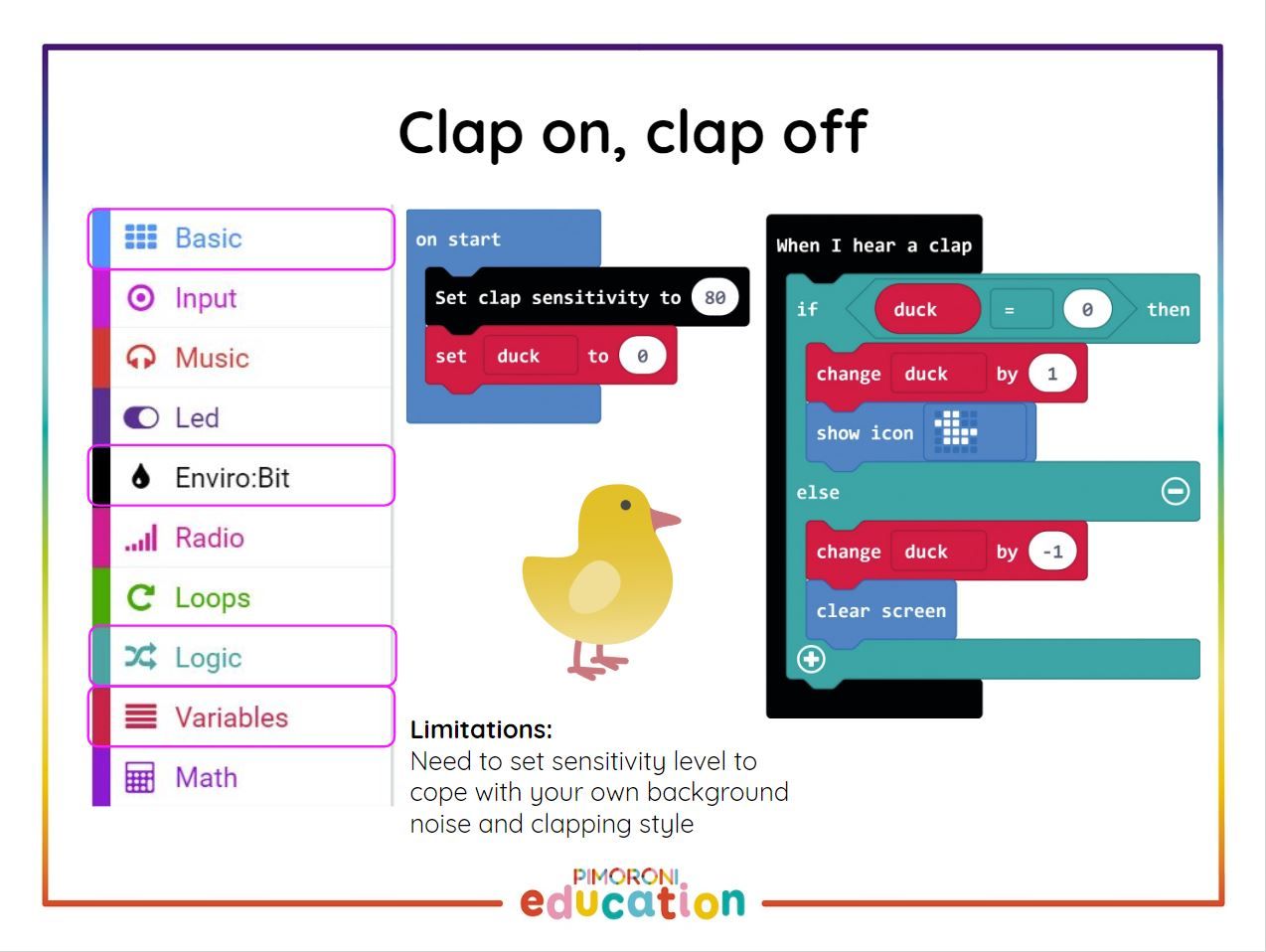 The enviro:bit has a microphone on it, which can detect a clap sound. You will find the "when I hear a clap" block in the envirobit part of the menu. To make a simple version of this code, you could simply say "when I hear a clap"... "show icon of a duck". What we want to do is have the micro:bit remember if there is a duck or not.