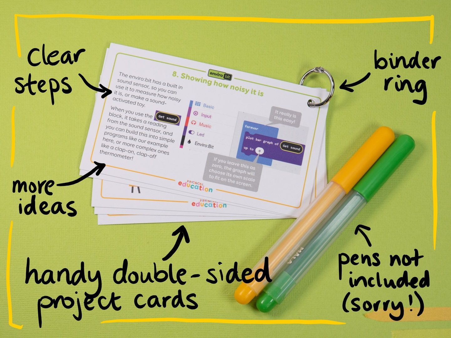 In fact, all of our micro:bit project kits come with cards! Look out for them in the scroll:bit, enviro:bit, pin:bit and noise:bit kits. Each set comes with a handy metal clip ring to bind them together (just punch a hole in the corner), so you can keep them as separate sets or build them up into a project card collection!