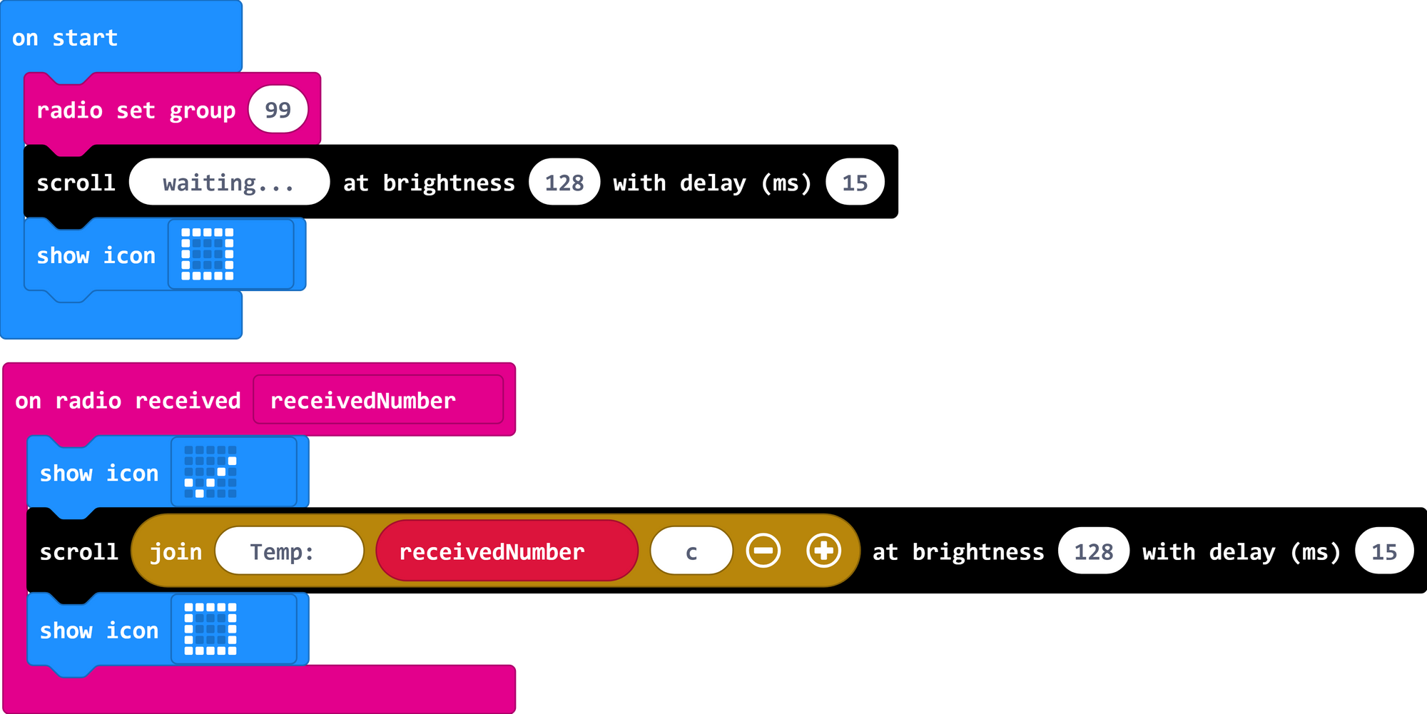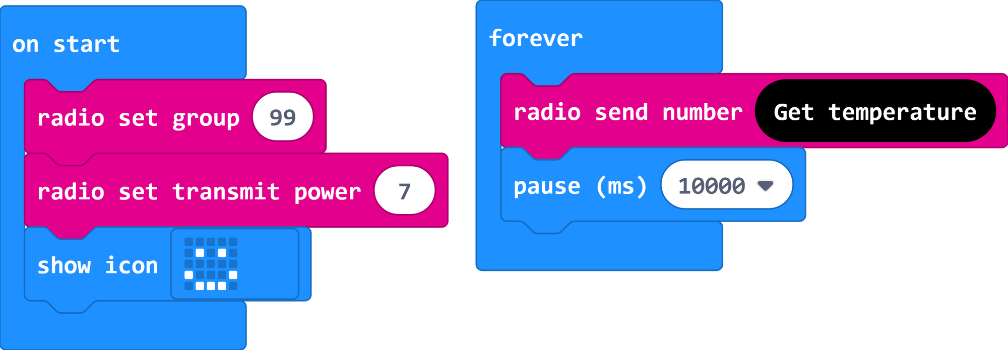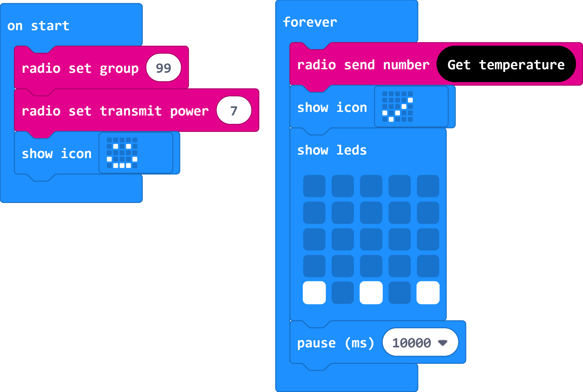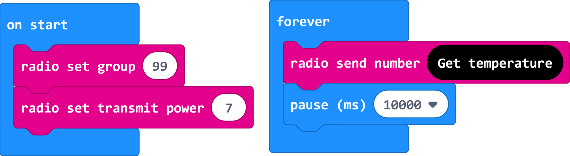 The micro:bit outside needs to take a temperature reading at regular intervals, and radio the number to the other micro:bit that is inside. In pseudocode, this is: