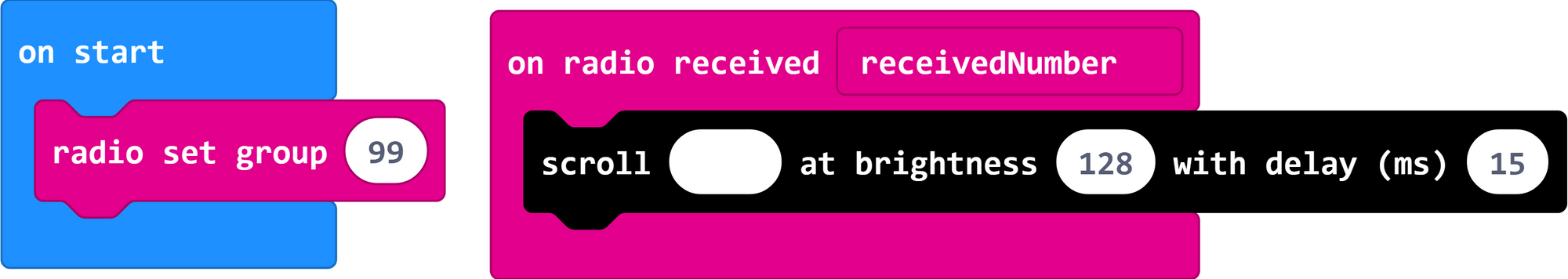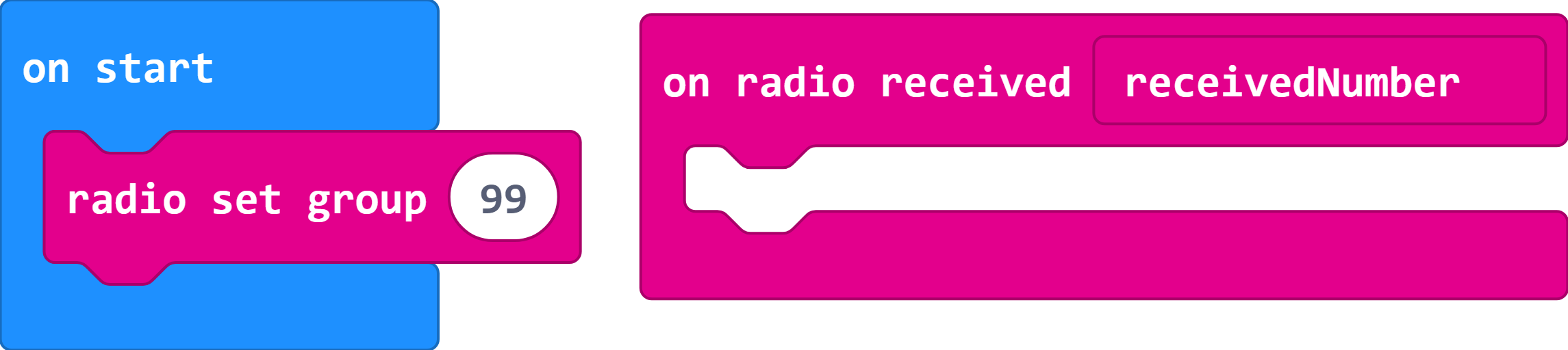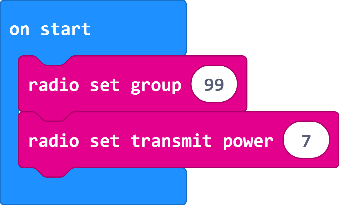 First, we need to set up the radio. You can pick any number between 0 and 255 for the channel - it doesn't matter what you choose, as long as you use it on the other micro:bit. We're going to use 99.