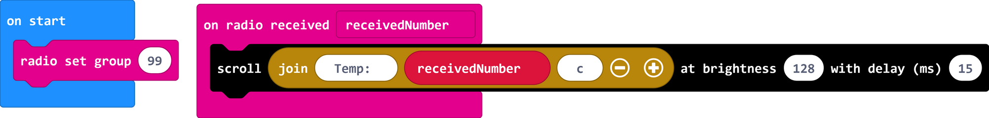 That received number is the temperature, so we need to show it on the scroll:bit. Add in a block to scroll some information.