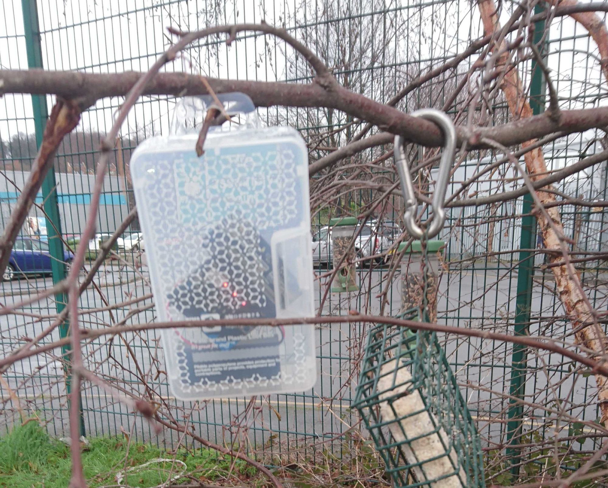 This is it for the first micro:bit. Once you've copied the code across, push on the enviro:bit, attach a battery pack, pop the whole thing in a food bag or a sandwich box, and find somewhere safe to put it outside. (We started with a sandwich box but it also worked with a Loot Box and we confused the birds!)