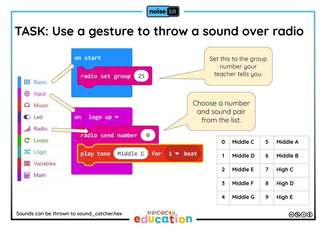 The activity is to program a micro:bit to send the right number for a particular note to the sound catcher, and in this way you can either play a tune using one micro:bit and lots of gestures, or many micro:bits using the same gesture.