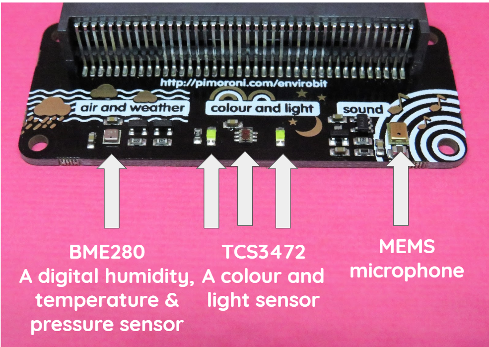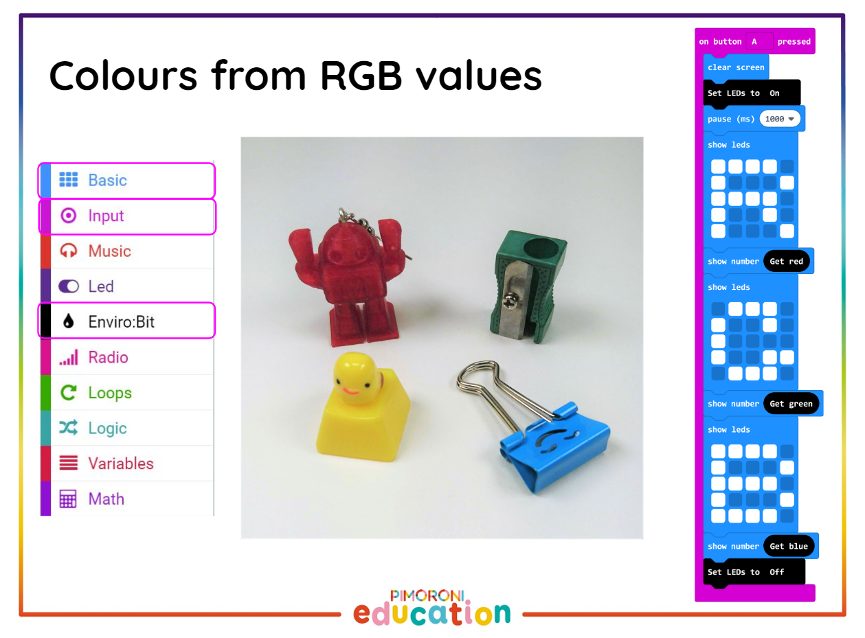 The light sensor on the enviro:bit can detect colours as well as light, so we investigated the amount of red, green, and blue light detected by placing different objects next to the sensor.