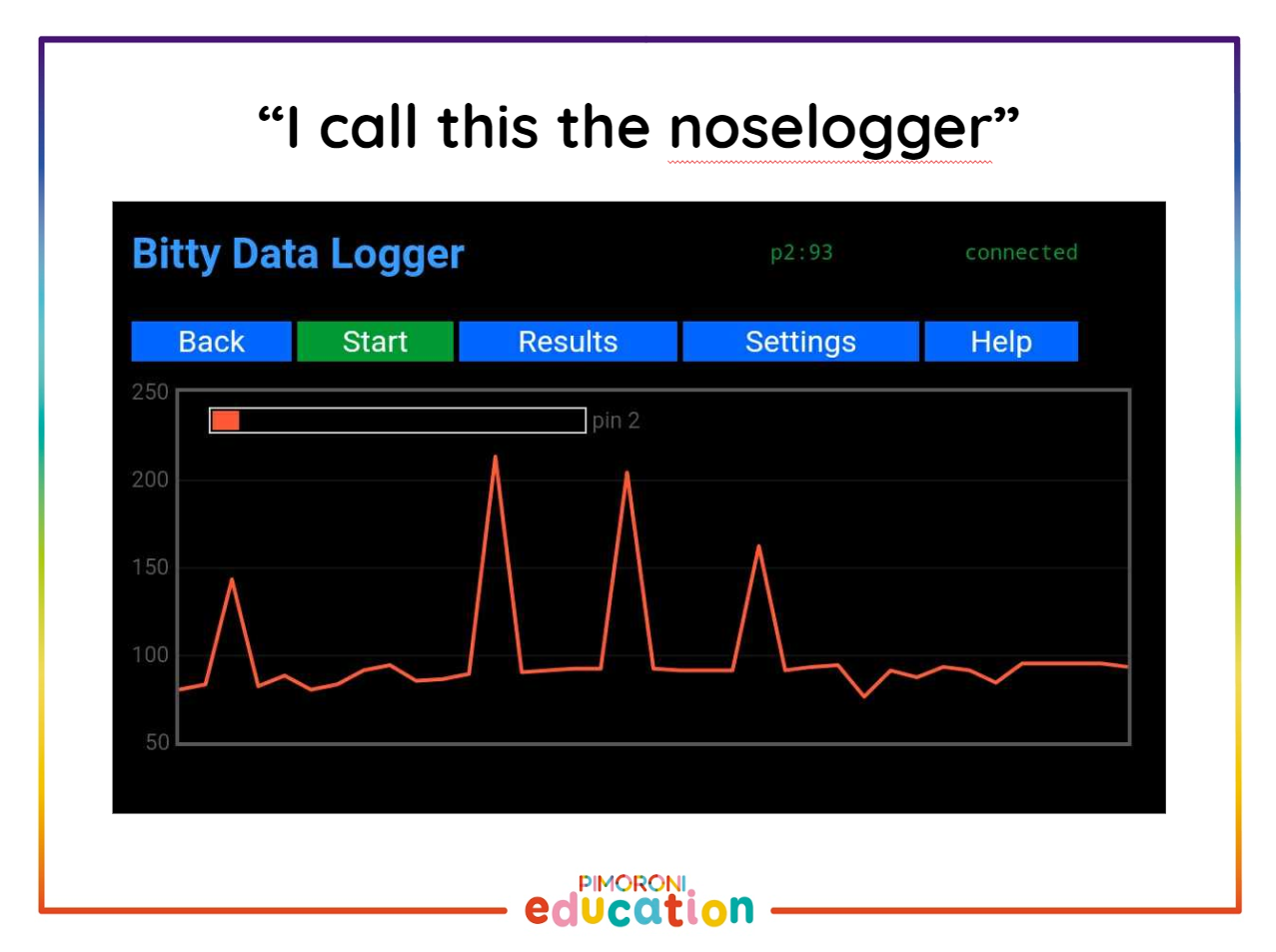 Sadly, time was running out so we had a quick demo of the noselogger - which was the colour sensor set to detect... my nose.