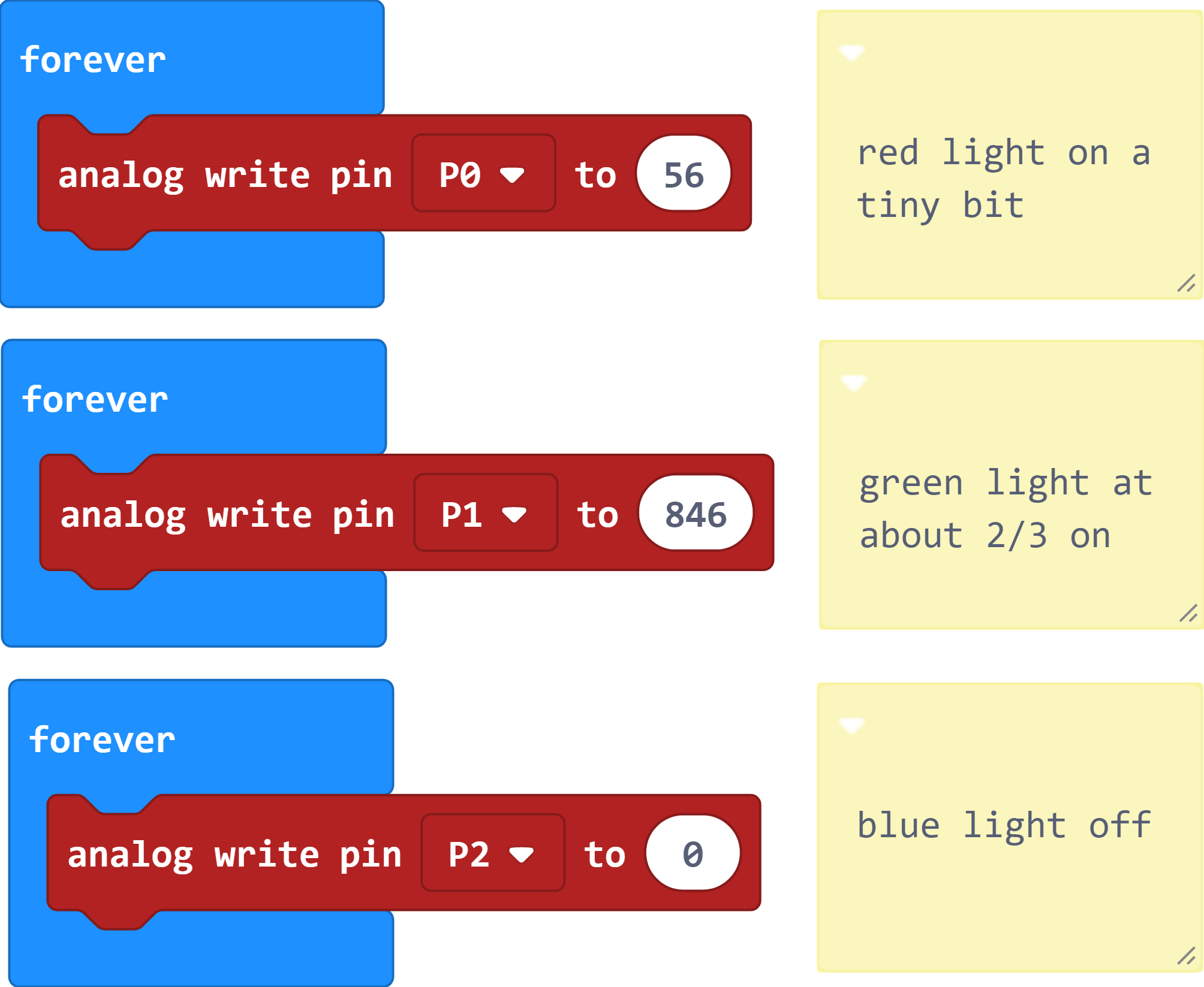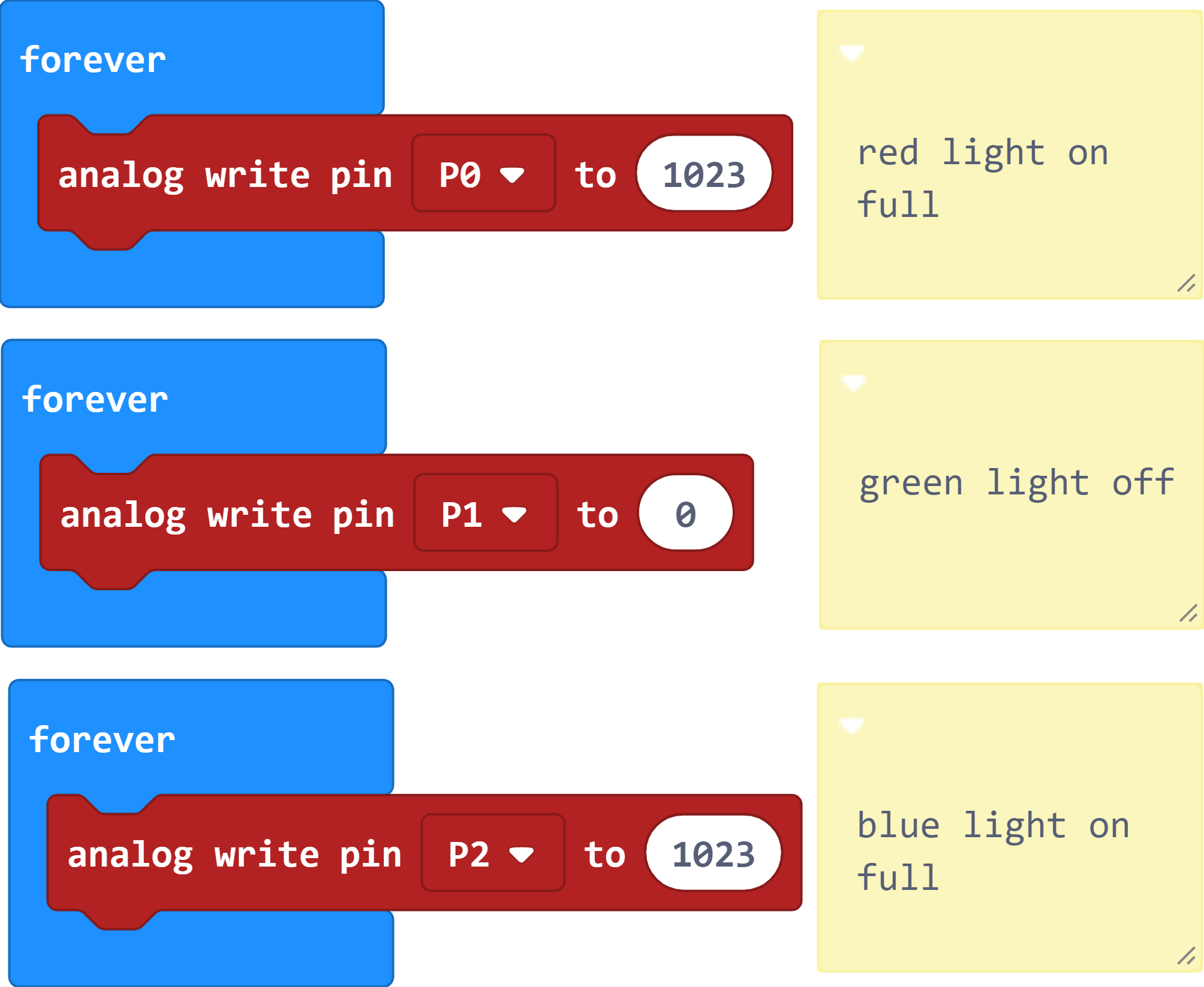We need three bits of code to run at the same time - one to control each colour. You will find the red blocks in the "Pins" part of the menu, and the blue blocks in "Basic".