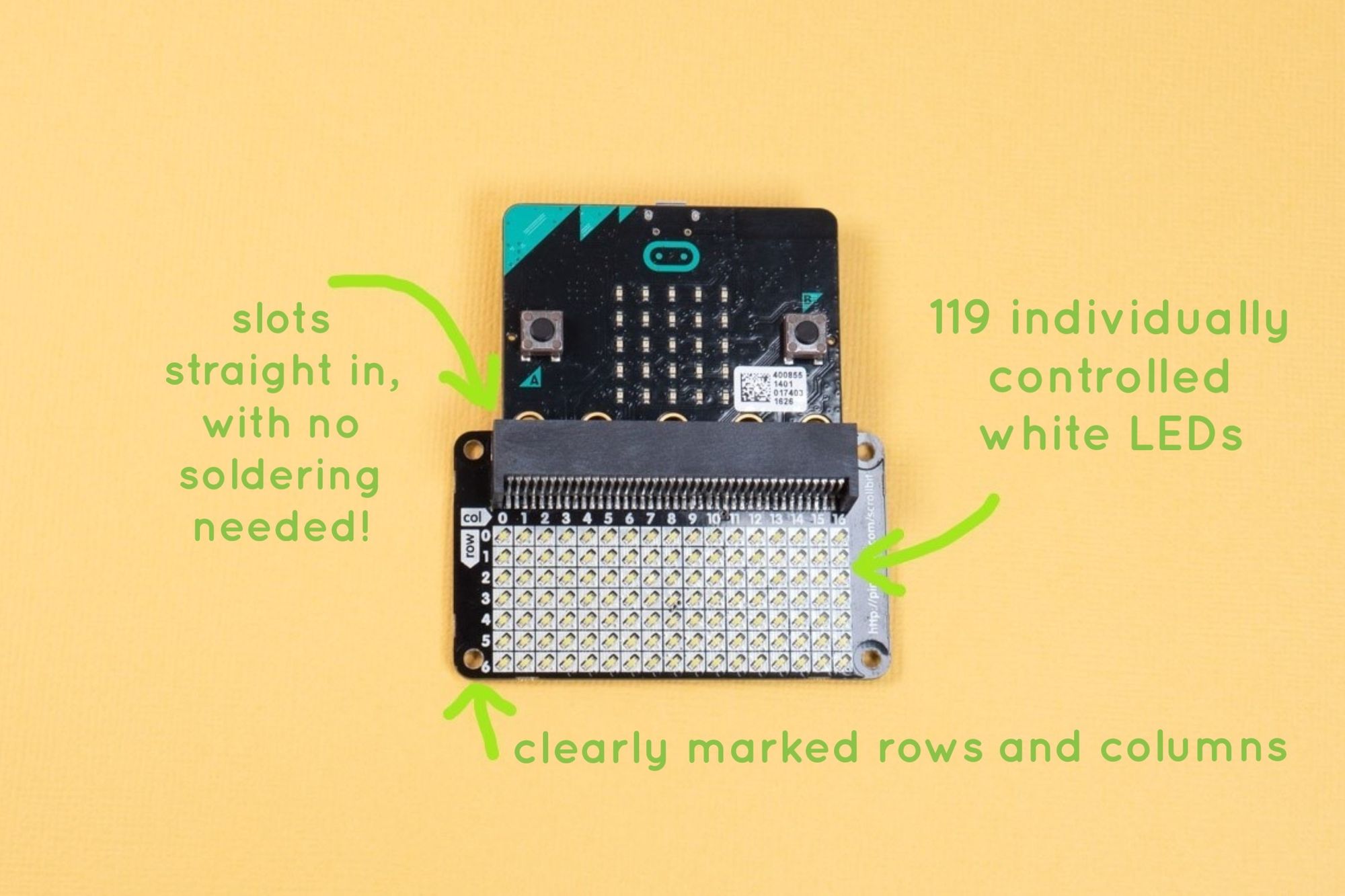 The scroll:bit is a little display with a lot of pixels! Its 119 bright white LEDs are perfect for scrolling messages with your micro:bit, or for animations, graphs, and more!