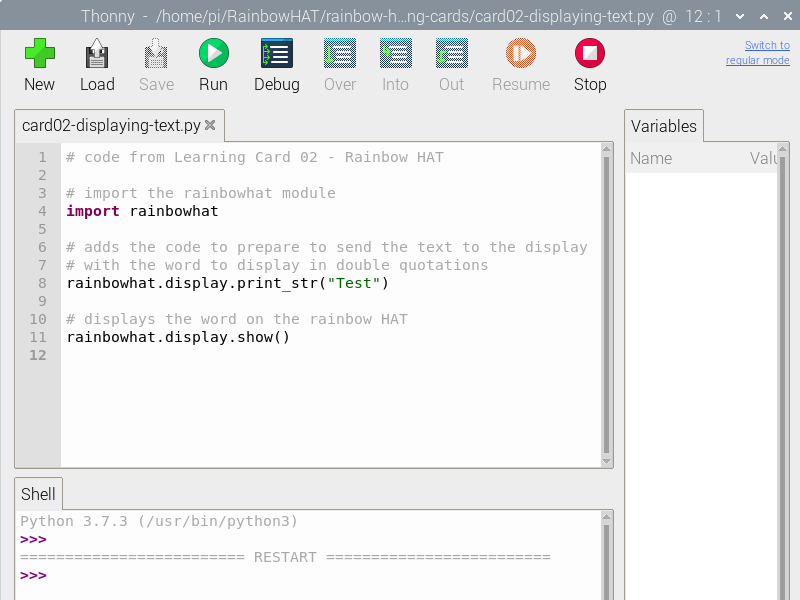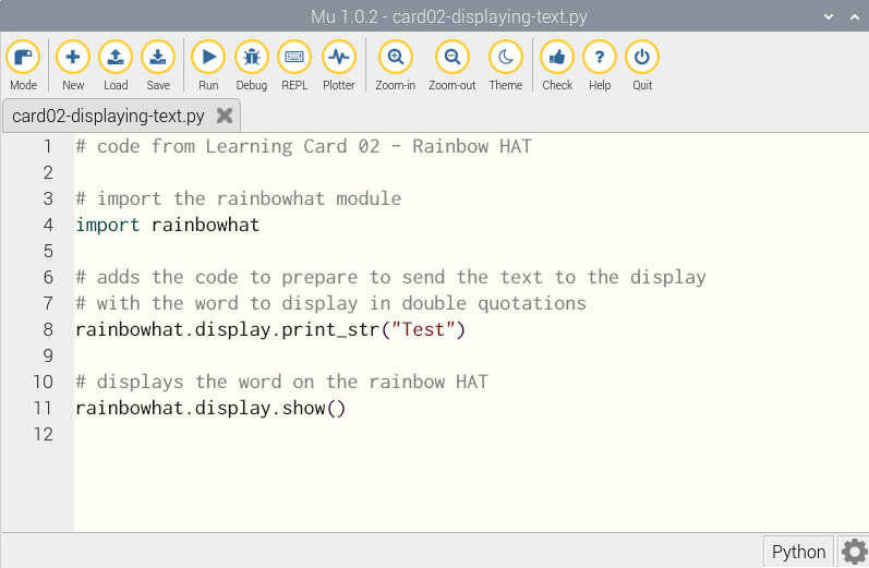 Once you have typed in your code, run it (in Thonny and Mu, press Run). You should see the word "Test" appear on the display.