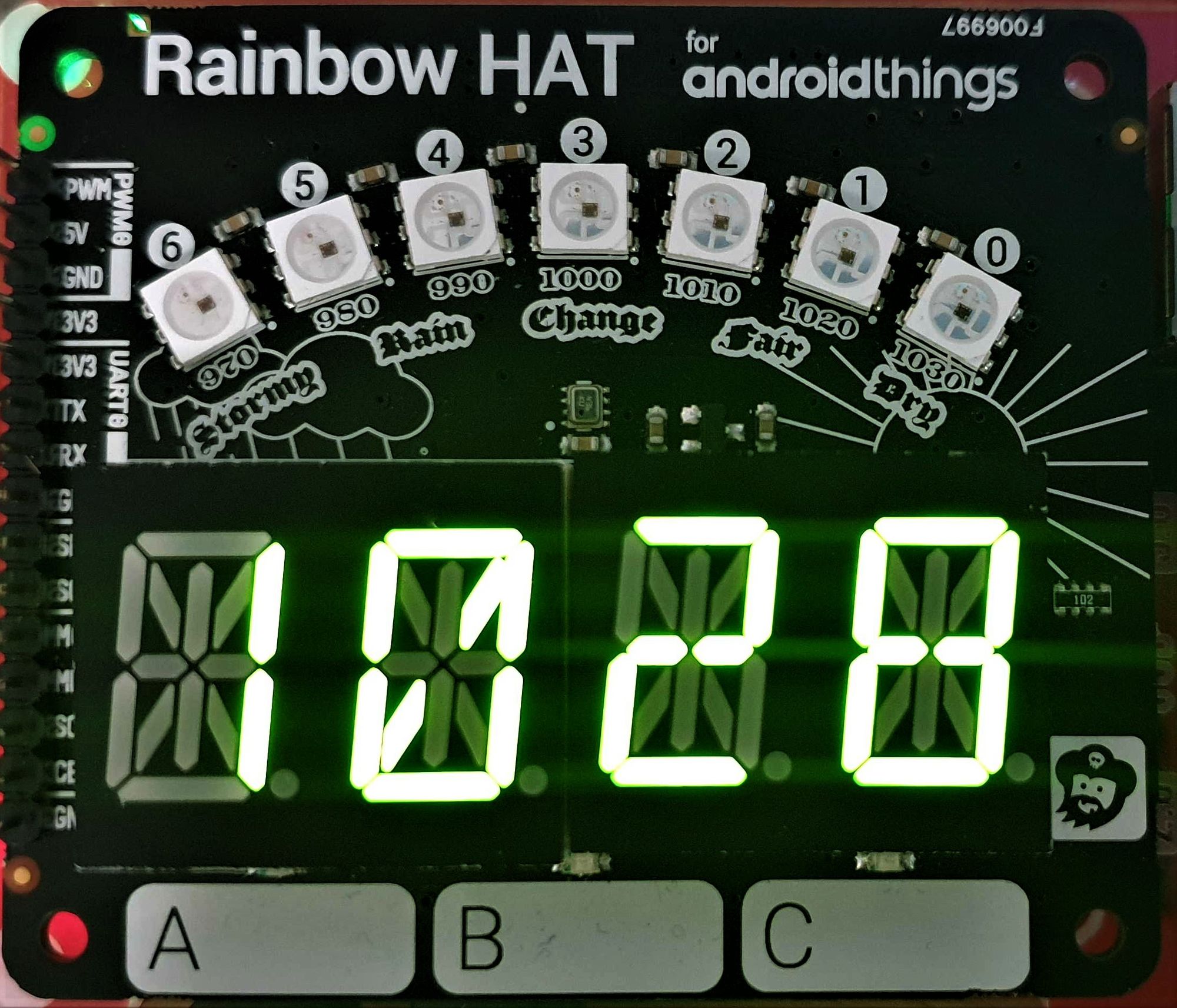 As before, run your code and look for a reading on the display. Normal air pressure is around 1000 hPa, but it depends on the weather. Find out more here.