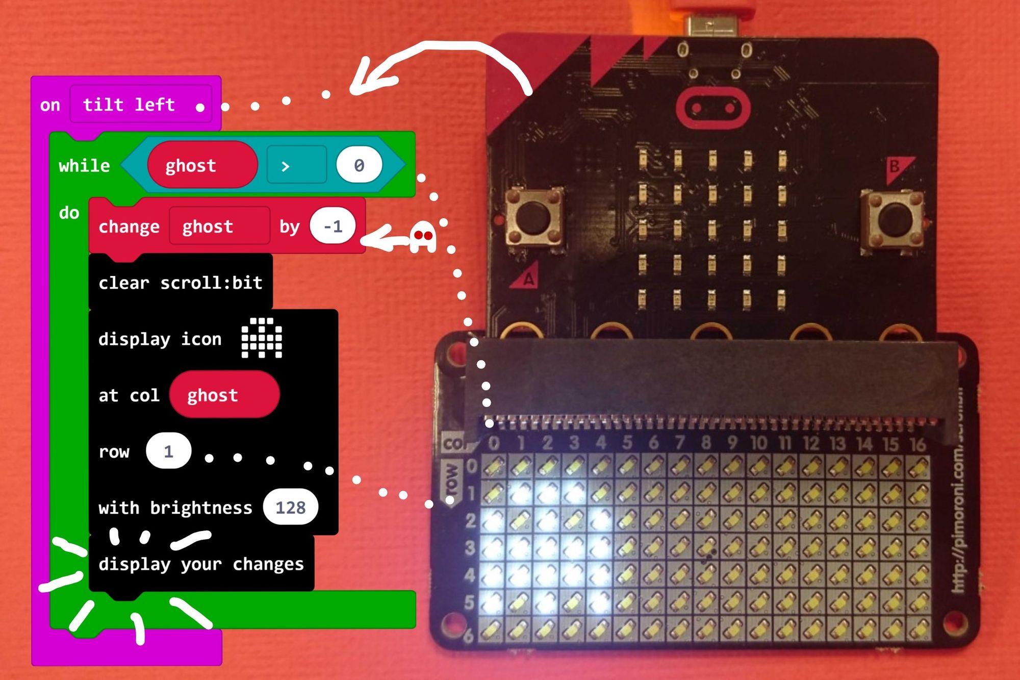 Select tilt left and then we can start putting the code in. We know that if the ghost is all the way over on the left, it's starting in column 0. Therefore, we can let the code make the column smaller, as long as it's bigger than 0, without the ghost falling off the screen.