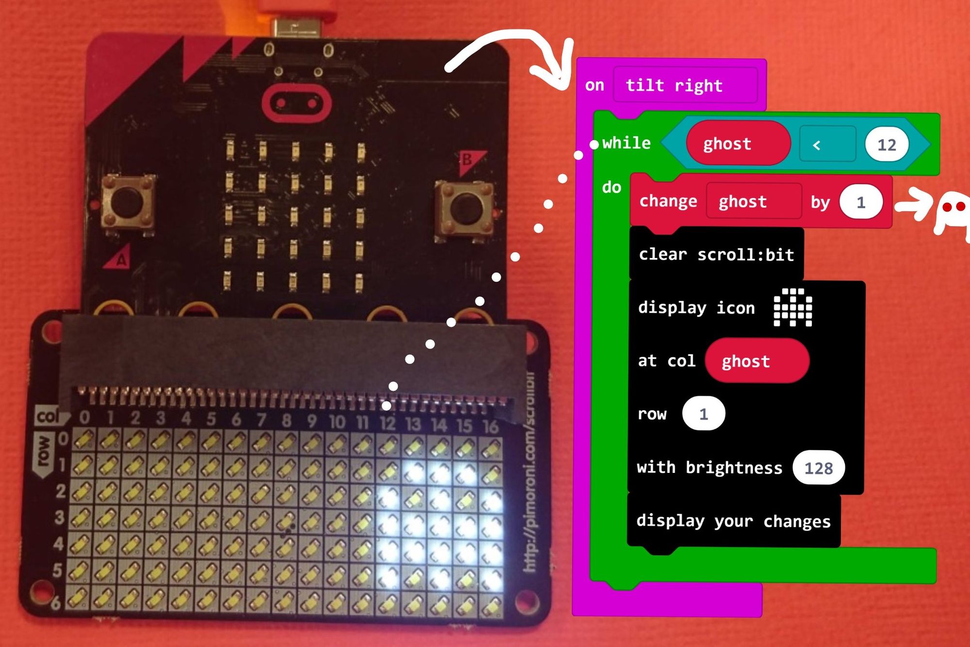 Have a look at the "set pixel" block in the scroll:bit code. Could you use that to draw on the screen?