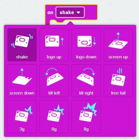 3. The "Tilt Left" section. The tilt commands are a bit hard to find. Go into the Input menu and look for on shake. If you drag that block across to your code and click on it, you'll see you can choose all sorts of motions.