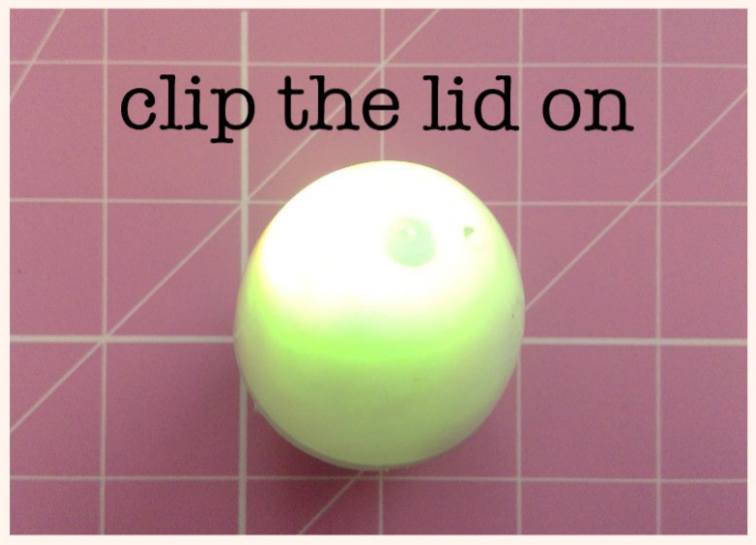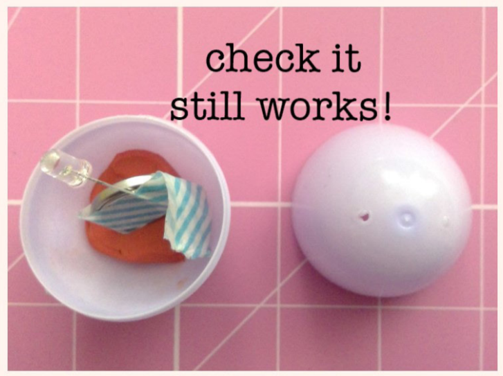 Clip the lid of the egg on. If the light goes out when you do this, it might be that the tape has come loose when you were pushing the battery into the clay. Open it back up and squeeze the tape on firmly.